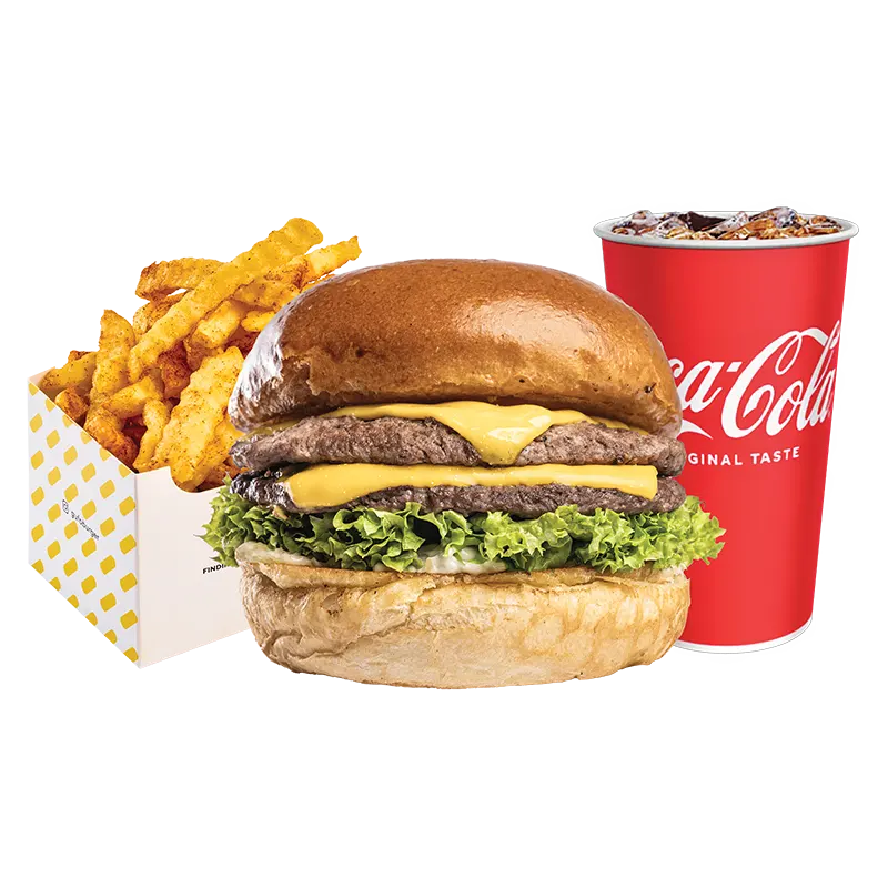 دو عدد برگر گوشت گوساله تازه، سس مخصوص، پنیر چدار، مخلفات + نوشابه و سیب زمینی